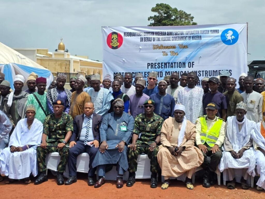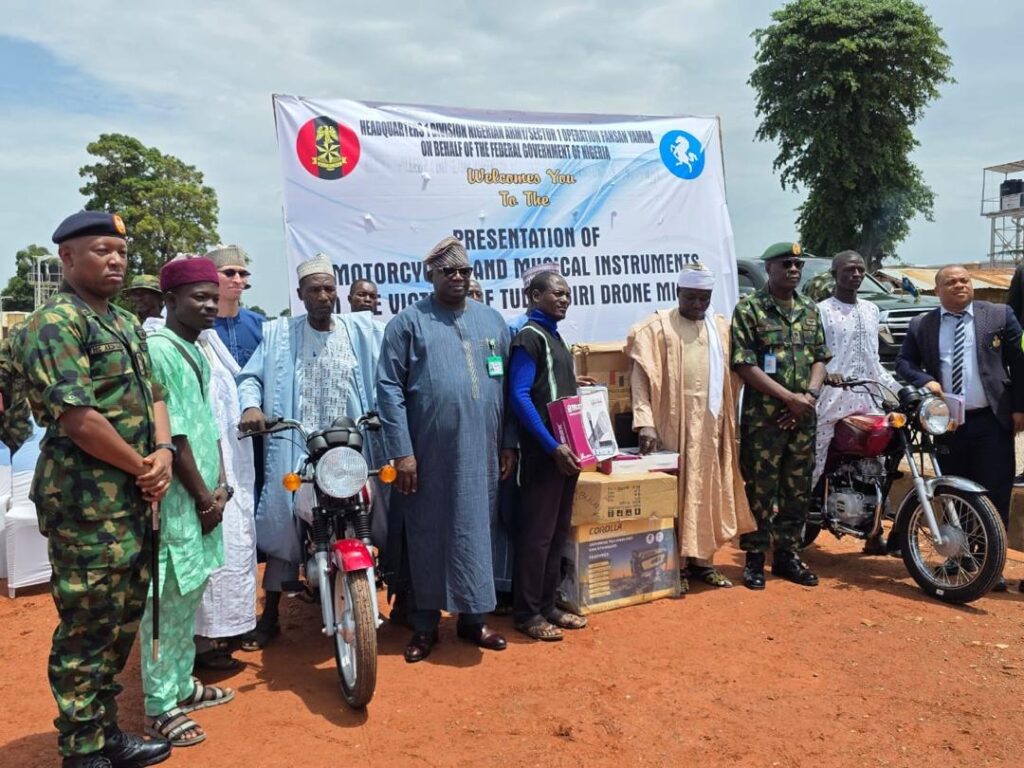 However, the latest phase of support came from the General Officer Commanding 1 Division Nigerian Army and Commander Sector 1 Operation Whirl Punch, Maj.-Gen. Lander Saraso, who on behalf of the Federal Government, distributed motorcycles, musical instruments, and other relief items to families that suffered losses.
